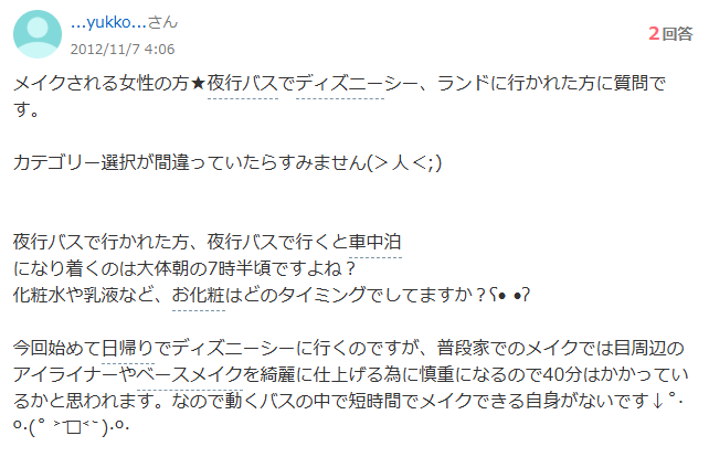 夜行バスで行かれた方、夜行バスで行くと車中泊 になり着くのは大体朝の7時半頃ですよね? 化粧水や乳液など、お化粧はどのタイミングでしてますか?ʕ• •ʔ